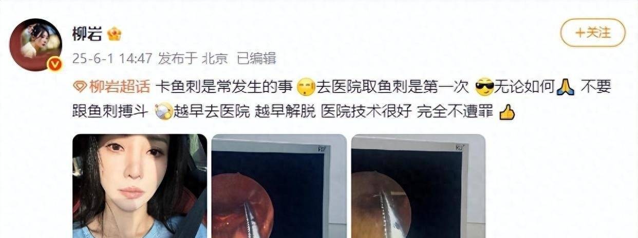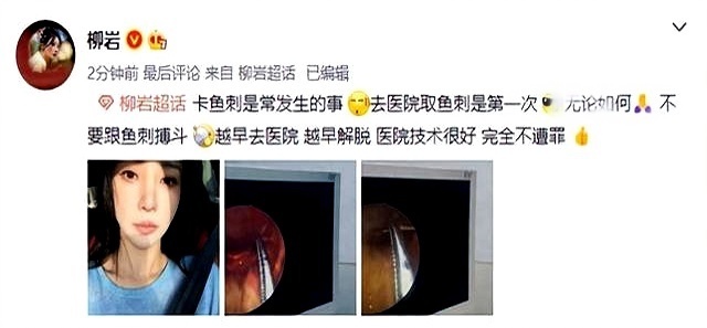 柳岩深夜急诊取鱼刺!这些夺命土方法千万别再试!柳岩深夜急诊取鱼刺!这些夺命土方法千万别再试!最近,女星柳岩因为一件小事紧急就医,让不少网友捏了把汗。原来她吃饭时被鱼刺卡住喉咙,起初想着用喝醋的土方法解决,结果异物感越来越强烈,连喝水都疼,最后只能深夜跑去医院求助。到了医院才发现,专业医生取鱼刺的过程比想象中轻松太多,完全没遭罪。柳岩事后特意发文感慨,劝大家被鱼刺卡住别硬扛,越早去医院越早解脱,千万别自己瞎折腾。